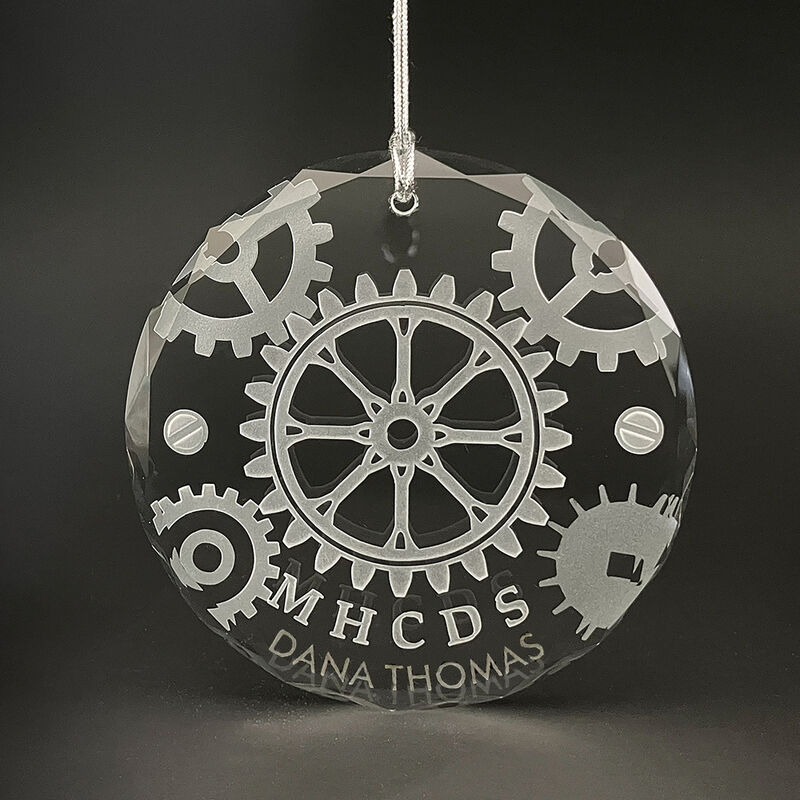 These feature a Steampunk Design. A divided gear in the center carved on the front side and a variety of etched mechanical gears on the reverse side to create a 3d depth to the glass piece, and abbreviated letters of the Master of Health Care Delivery Science (MHCDS).